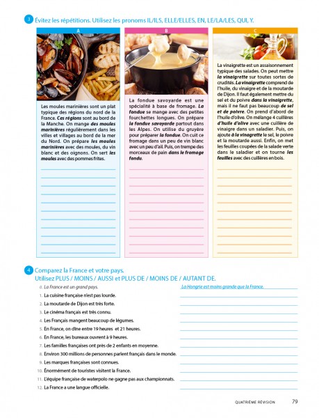 - kommunikációfejlesztő, párbeszédes feladatok külön fejezetben (Jeux de rôle);