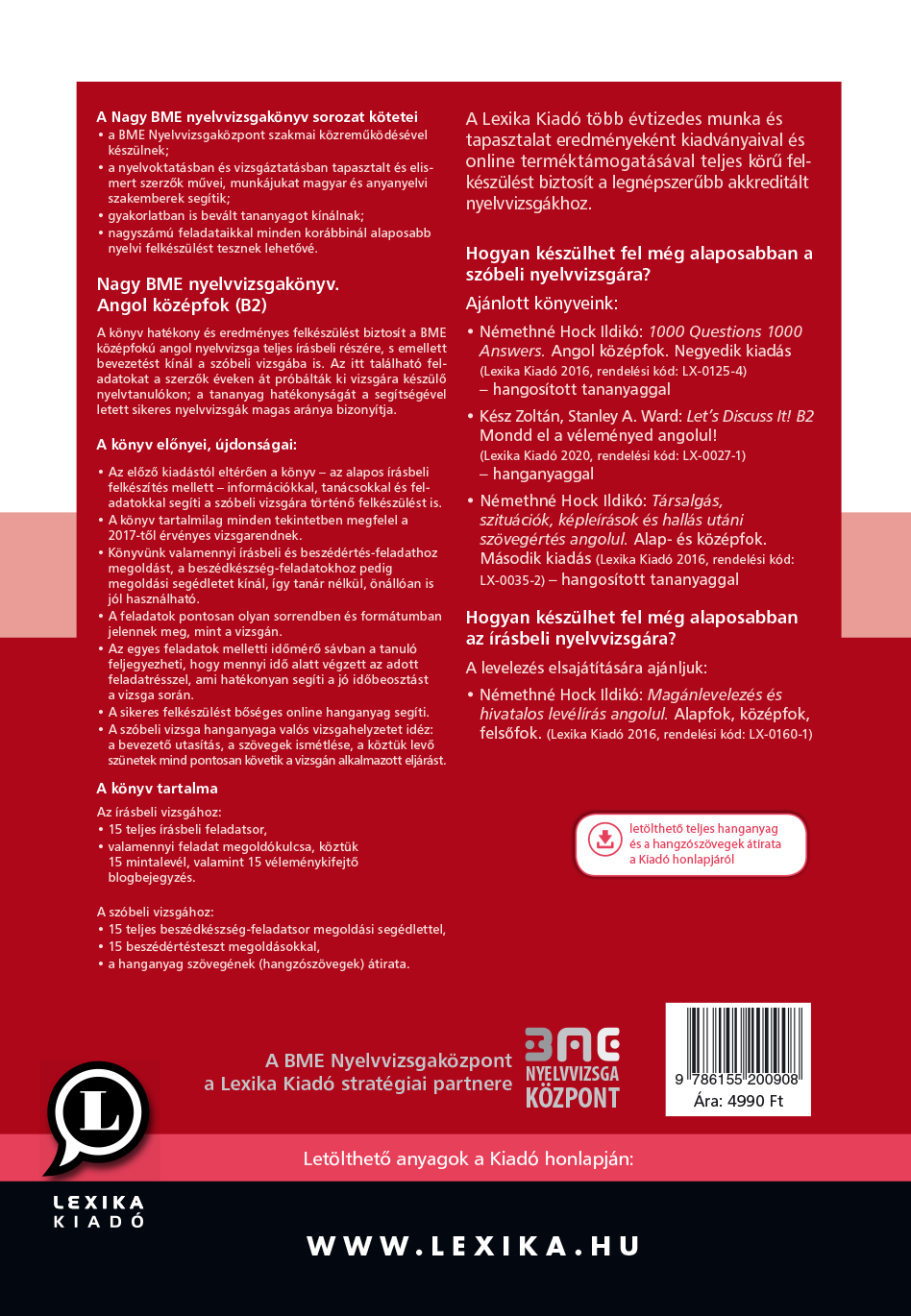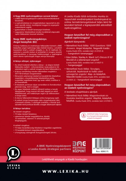 A könyv hatékony és eredményes felkészülést biztosít a BME középfokú angol nyelvvizsga teljes írásbeli részére, valamint – az előző kiadástól eltérően – immár a szóbeli vizsgára is. A bővített és megjelenésében is megújult negyedik kiadás tartalmában pontosan megfelel a nyelvvizsga 2017-től érvényes követelményeinek.A könyv a BME Nyelvvizsgaközpont mint a Lexika Kiadó stratégiai partnere szakmai-minőségbiztosítási együttműködésével jött létre, és a vizsgaközpont ajánlásával kerül olvasóink kezébe.