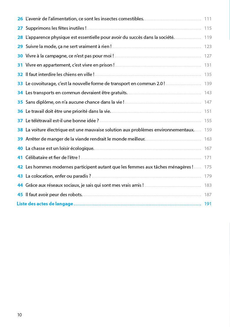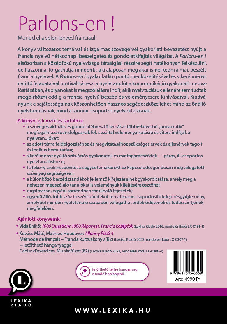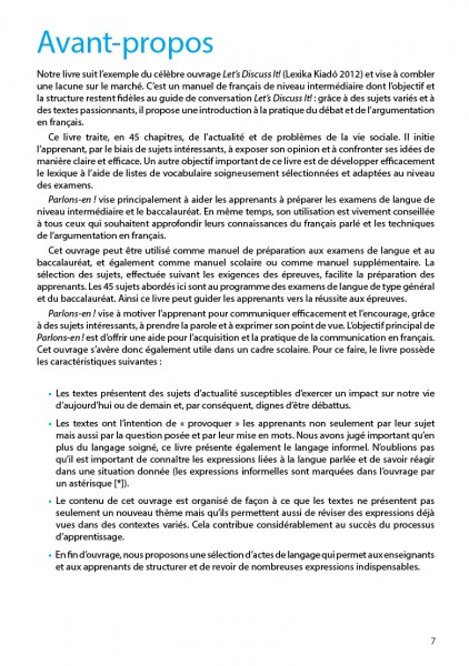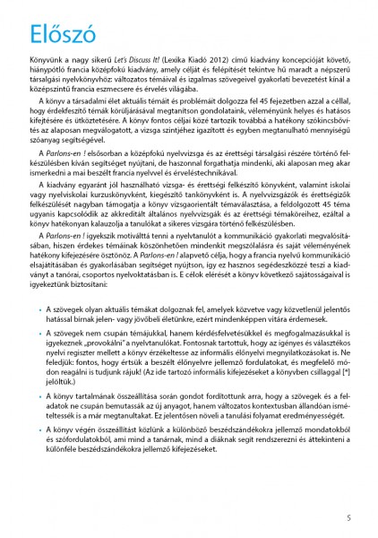 A könyv változatos témáival és izgalmas szövegeivel gyakorlati bevezetést nyújt a francia nyelvű hétköznapi beszélgetés és gondolatkifejtés világába. A Parlons-en ! elsősorban a középfokú nyelvvizsga, valamint a közép- és emelt szintű érettségi társalgási részére segít hatékonyan felkészülni, de haszonnal forgathatja mindenki, aki alaposan meg akar ismerkedni a mai, beszélt francia nyelvvel.