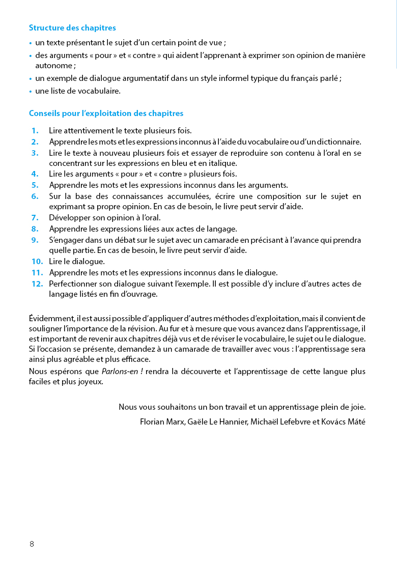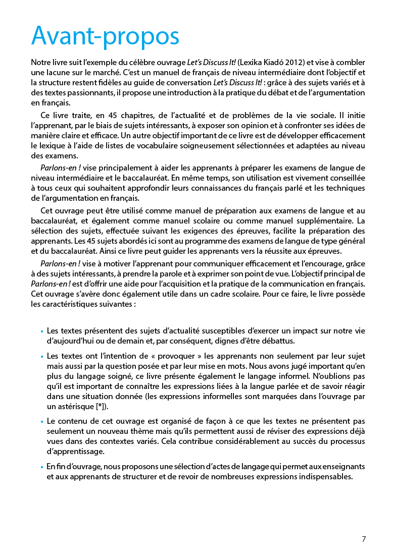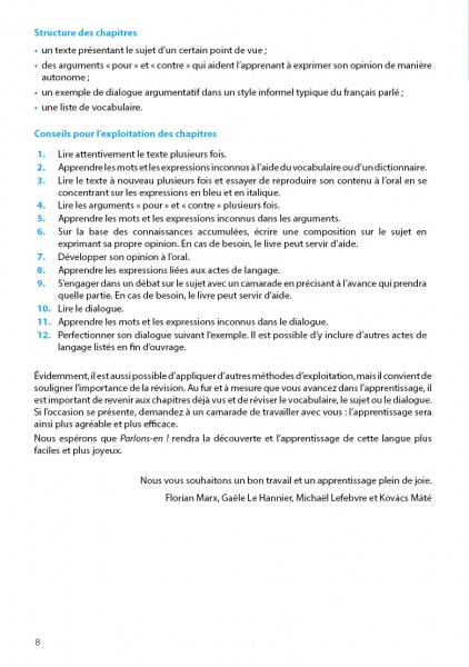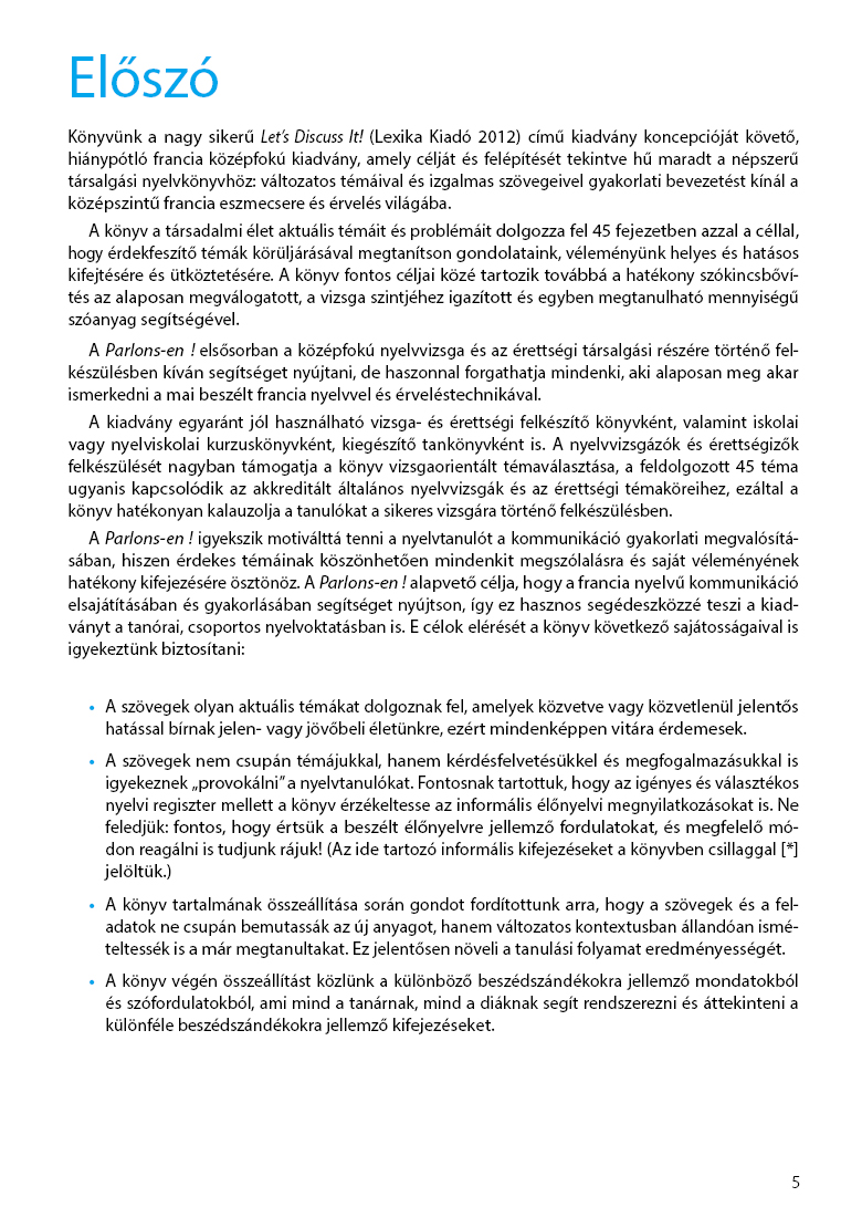 A Parlons-en ! gyakorlatközpontú megközelítésével és sikerélményt nyújtó feladataival motiválttá teszi a nyelvtanulót a kommunikáció gyakorlati megvalósításában, és olyanokat is megszólalásra indít, akik nyelvtudásuk ellenére sem tudtak megbirkózni eddig a francia nyelvű beszéd és véleménycsere kihívásaival. Kiadványunk e sajátosságainak köszönhetően hasznos segédeszköze lehet mind az önálló nyelvtanulásnak, mind a tanórai, csoportos nyelvoktatásnak.