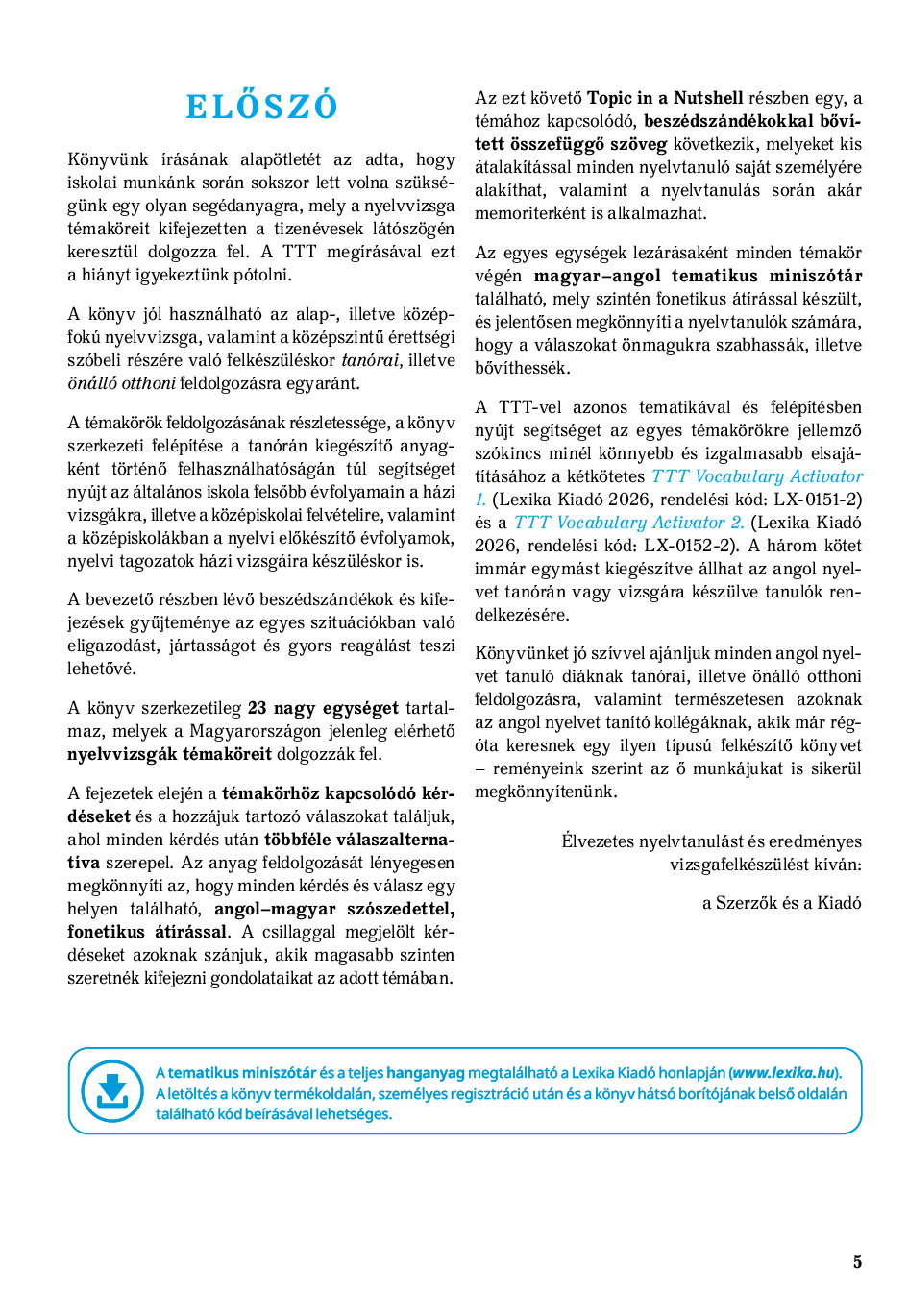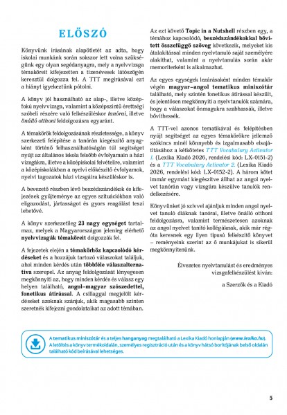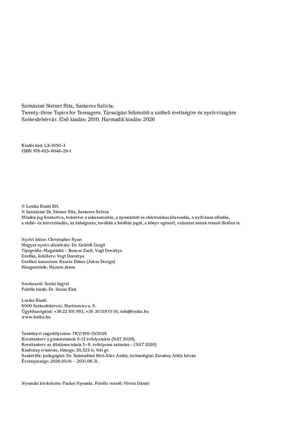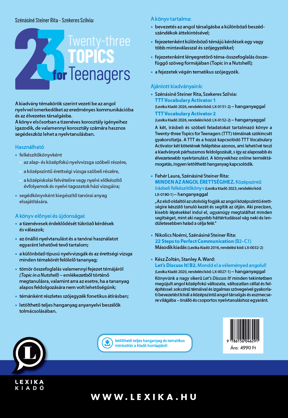 A Twenty-three Topics for Teenagers című kiadvány (közkedvelt nevén TTT) a felső tagozatosok, a nyelvi előkészítő osztályok, kéttanítási nyelvű iskolák, az érettségizők, nyelvvizsgázók, és felkészítő tanáraik körében nagy népszerűségnek örvendő, többször korszerűsített tankönyve. Jelen kiadása a kor változásainak megfelelő, korszerű lexikai tartalmával, tanulóbarát elrendezésével, és az ehhez kapcsolódó motiváló tipográfiájával és képanyagával, valamint a frissen elkészült hanganyaggal még inkább segíti az eredményes tanulást és az érettségire és a nyelvvizsgára való sikeres felkészülést.
